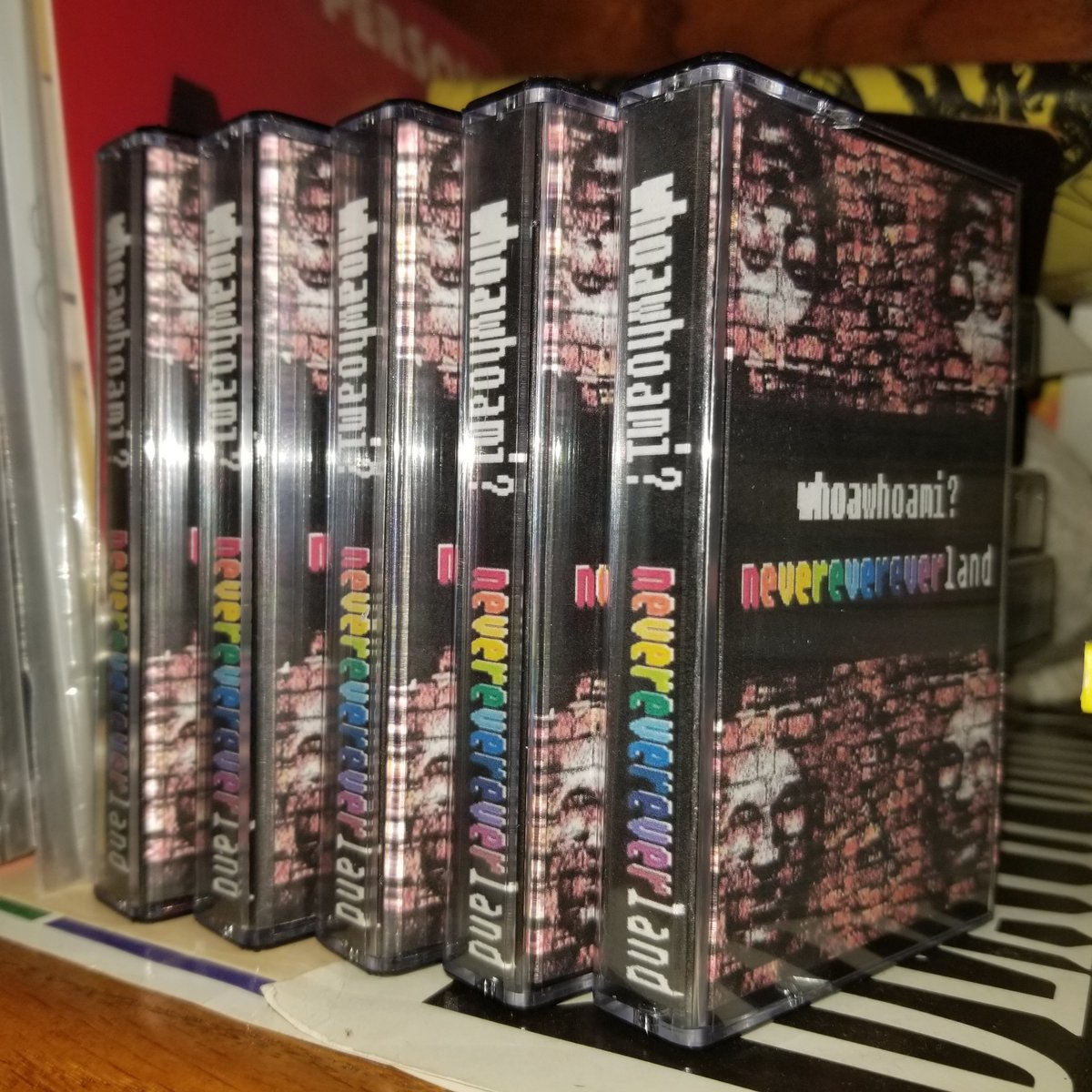 'neverevereverland' EP by whoawhoami? printed now on professionally duplicated cassette tape. Updated track-list, normal bias, home-made j-cards and labels by 'P.O.P. NETWORK' perfectly capturing the DIY aesthetic of the project.